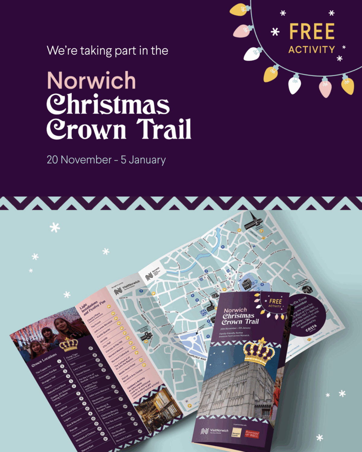Want some family fun while Christmas shopping in Norwich this year? Then why not search for crowns? The Norwich BID Christmas Crown Trail is a fantastic festive treasure hunt across our wonderful city, tasking trail-goers to find a range of Christmas displays, crowns and clues.