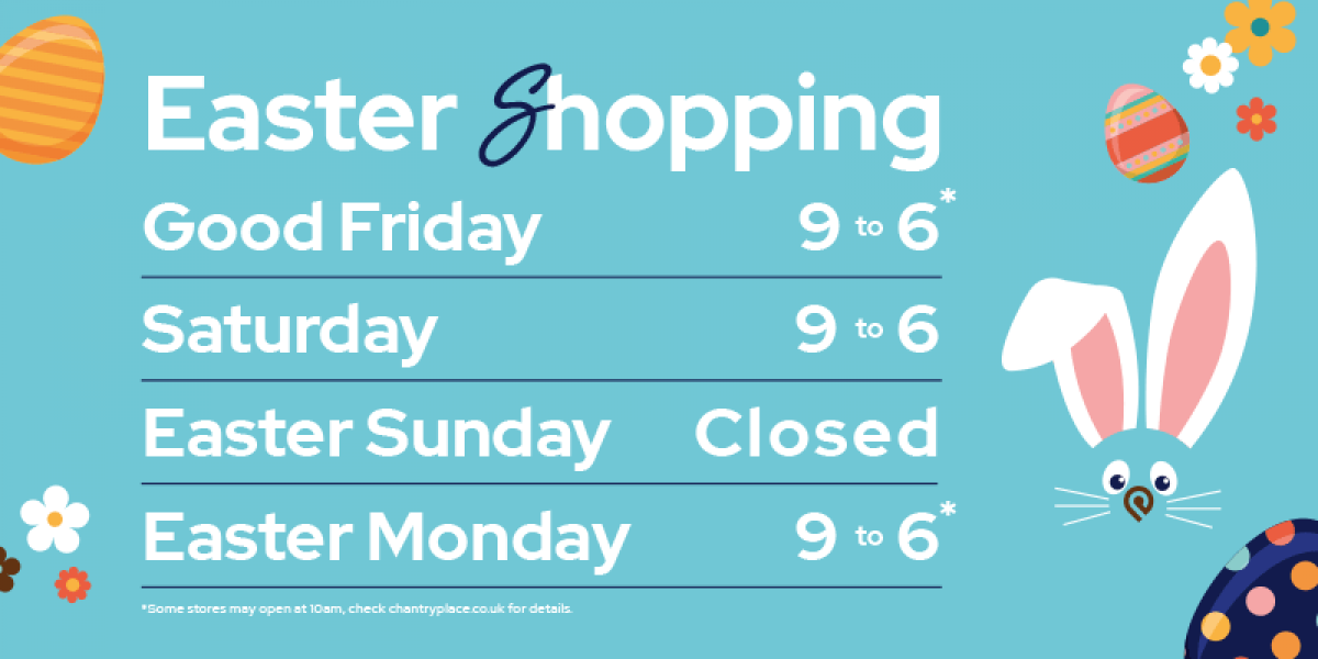 Remember that across the Easter bank holiday weekend, 15th to 18th April 2022, Chantry Place is open from 9am to 6pm, except for Easter Sunday when we are closed. Please note that some retailers will open at 10am on bank holidays, so please check individual store pages here https://chantryplace.co.uk/stores/