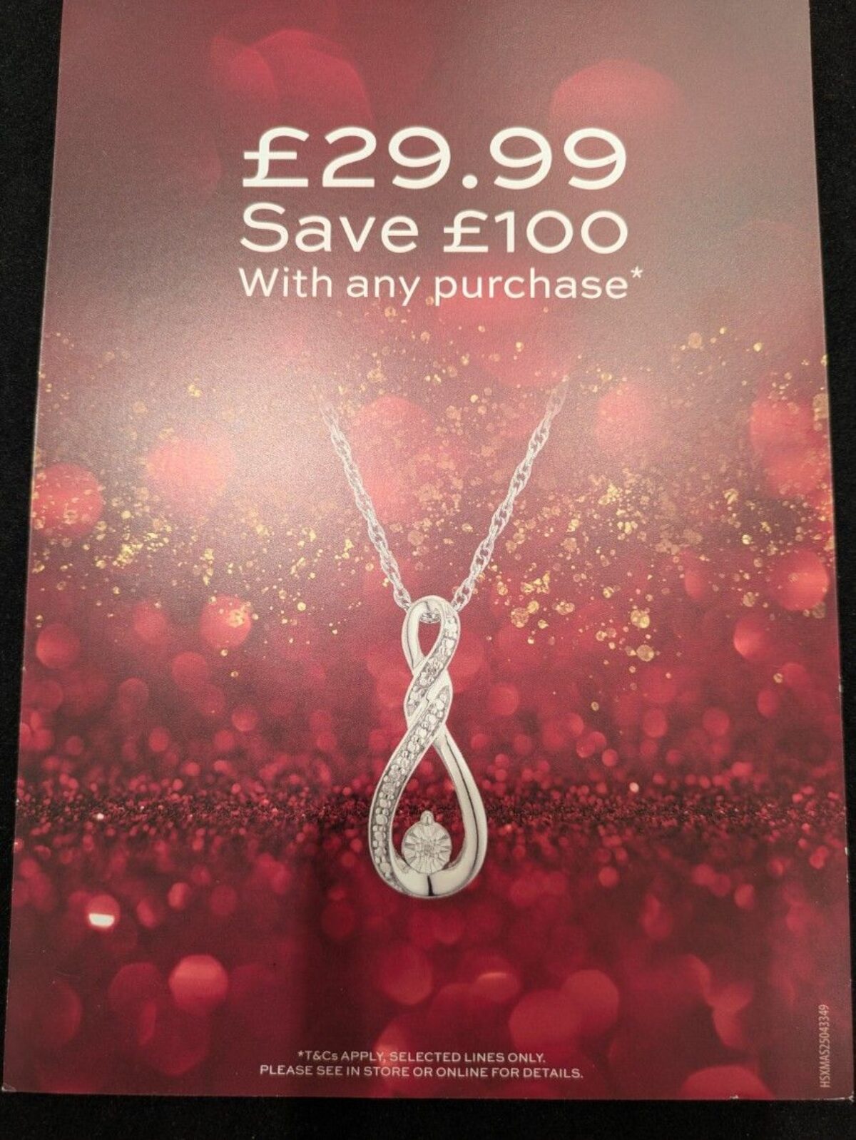 Save £100 on a sterling silver and diamond pendant when you make any purchase, now £29.99 instead of £129.99.